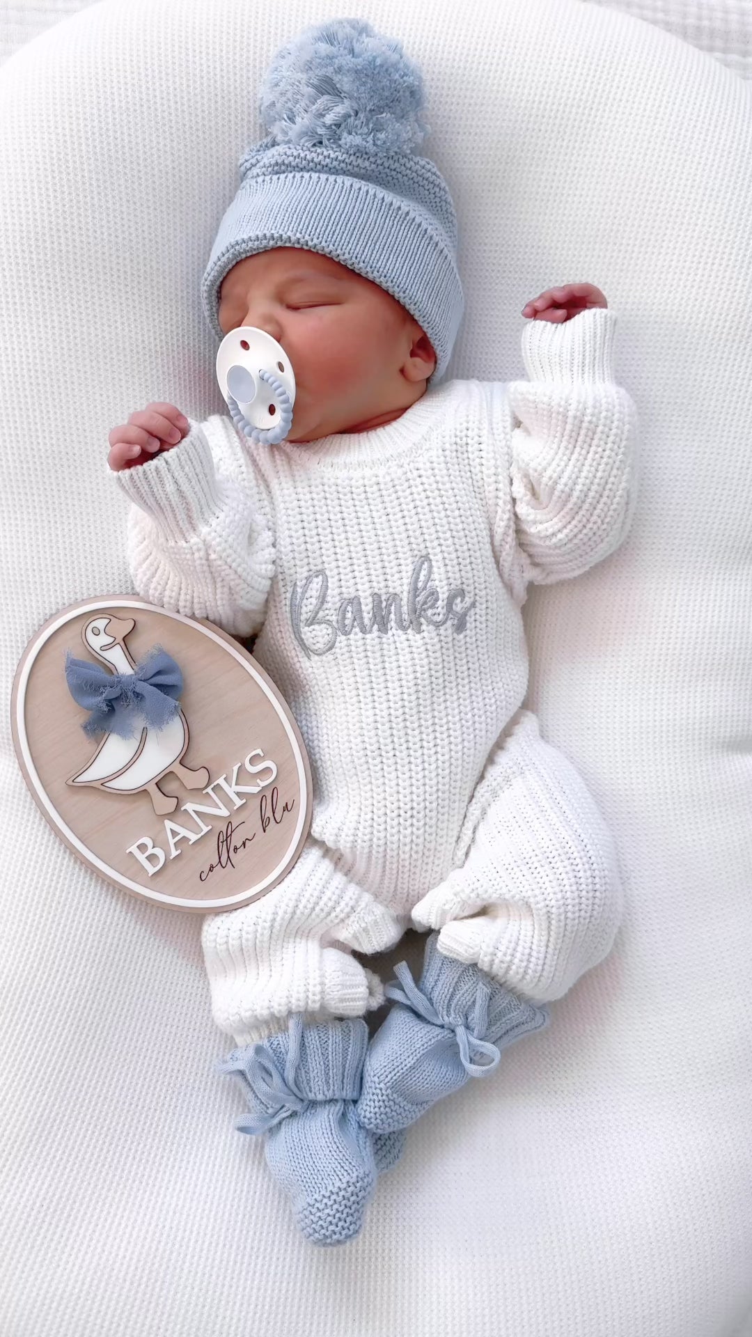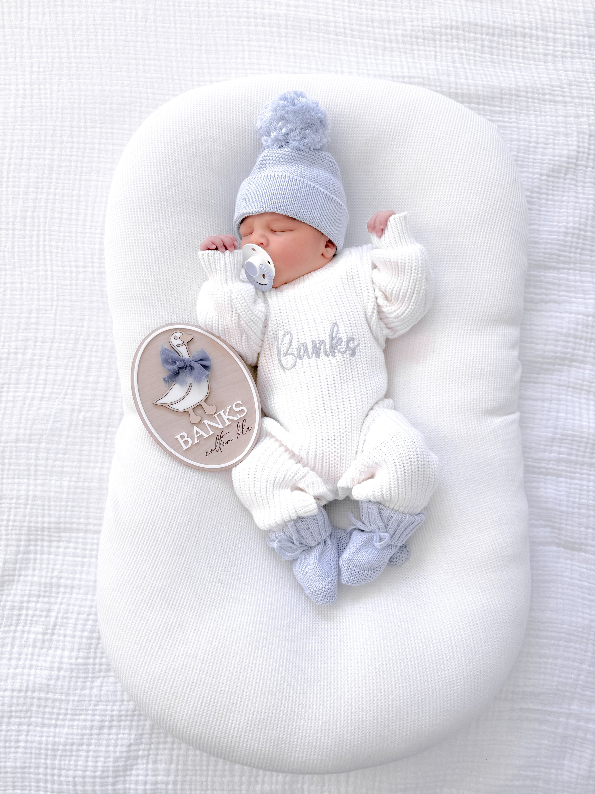 White in colour with white buttons on the leg area for easy access for nappy changes. Make sure you look at the matching white booties, hat/bow to pair for an announcement photo! PLEASE note all images look different on screens and phones, however all our blue pieces match the hat and booties we have to pair is a dusty blue NOT baby blue, but the thread we use to embroider it isn’t the same material used as the ones made to use on our knit items so they’ll never be the exact same colour.