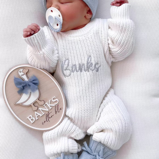 White chunky knit personalised announcement romper