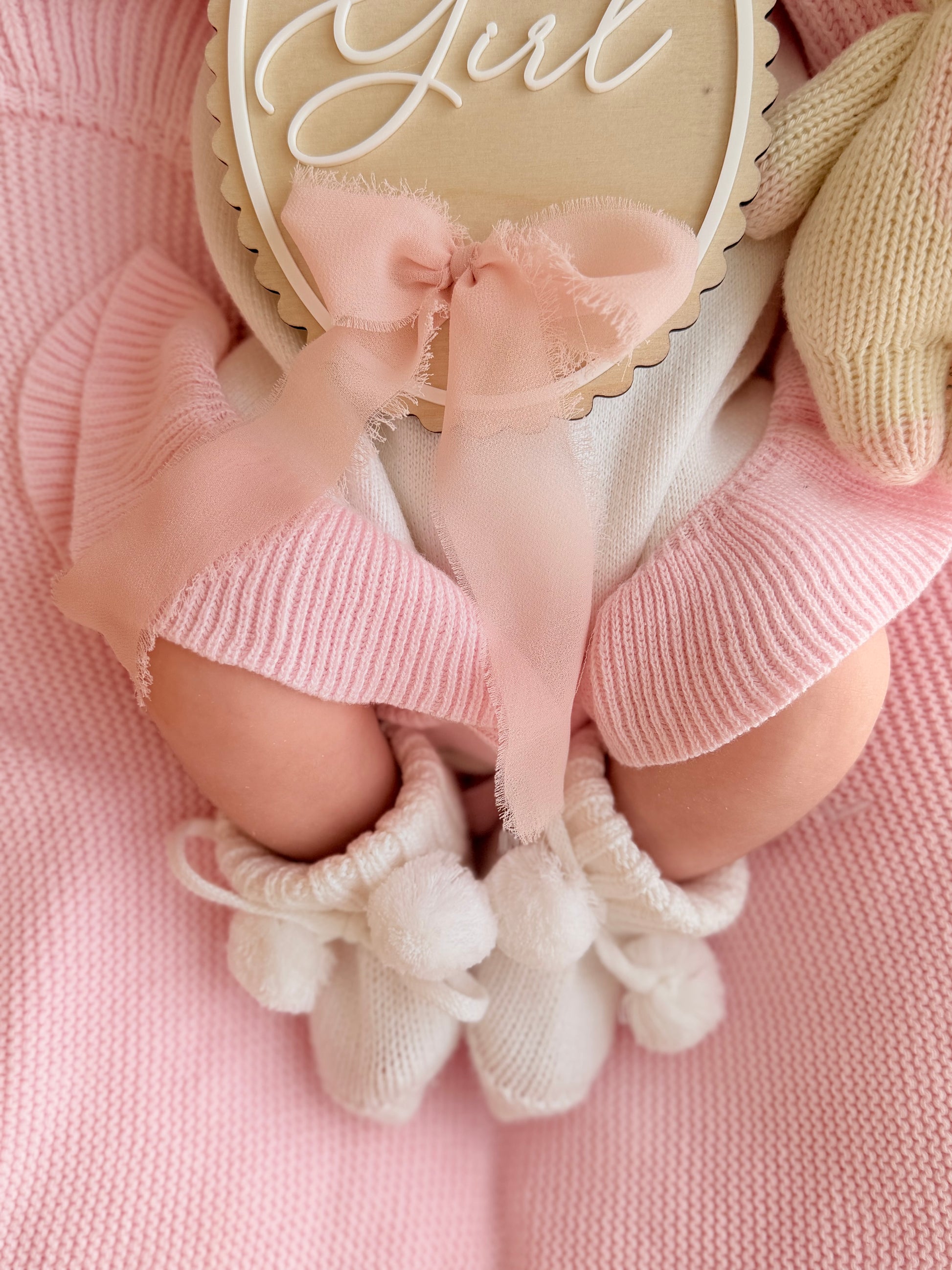 These gorgeous booties are a smaller soft knit with a white colour tone this colour matches our pom pom hat!