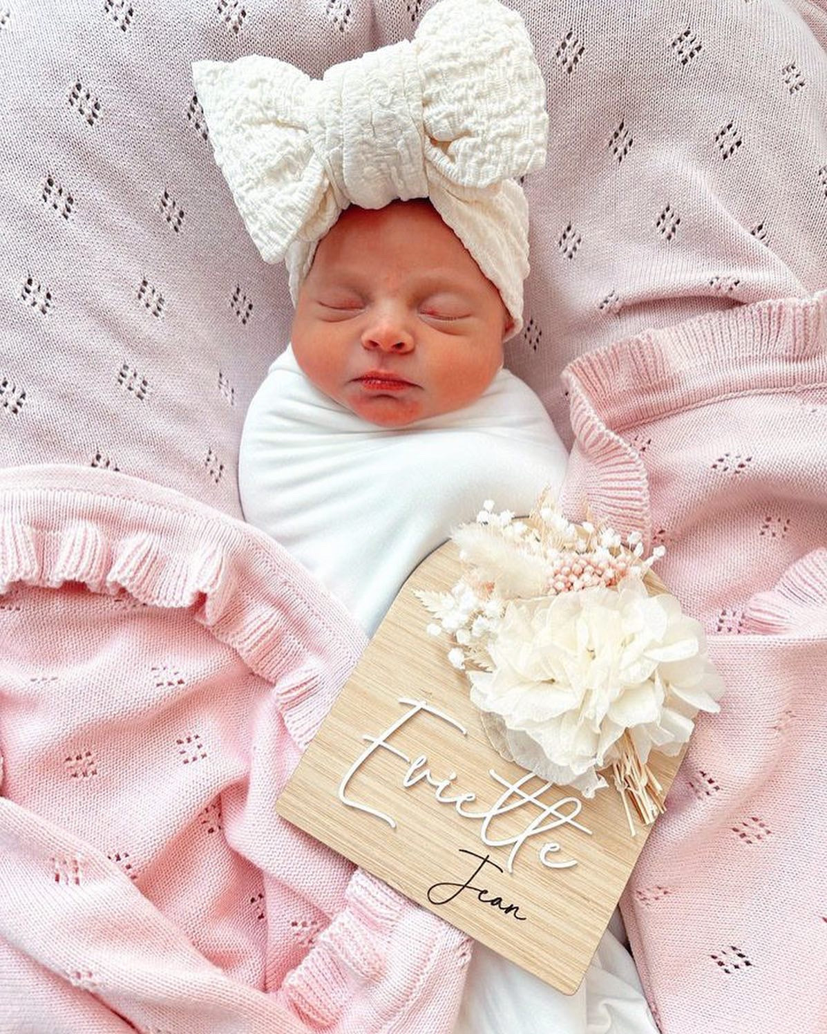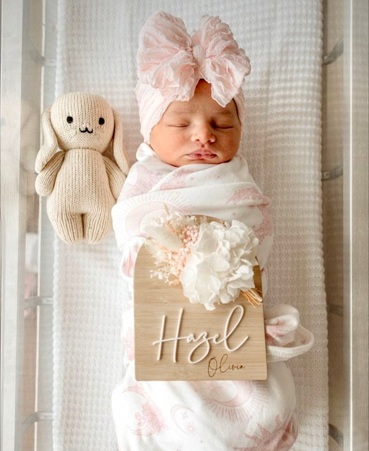 Made on 15cm Bamboo this stunning white bunch has a tiny bit of baby pink pieces in it making it such a pretty bunch for any little girl! Pick from round or arch shape, pick which font you’d like and also the name placement!